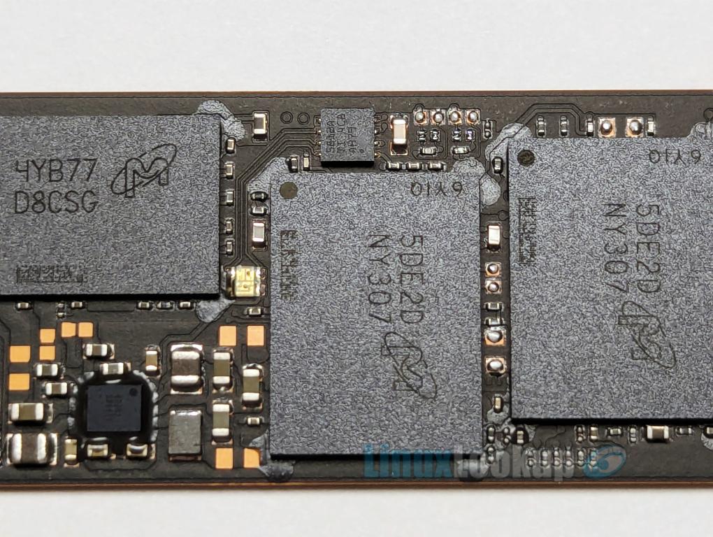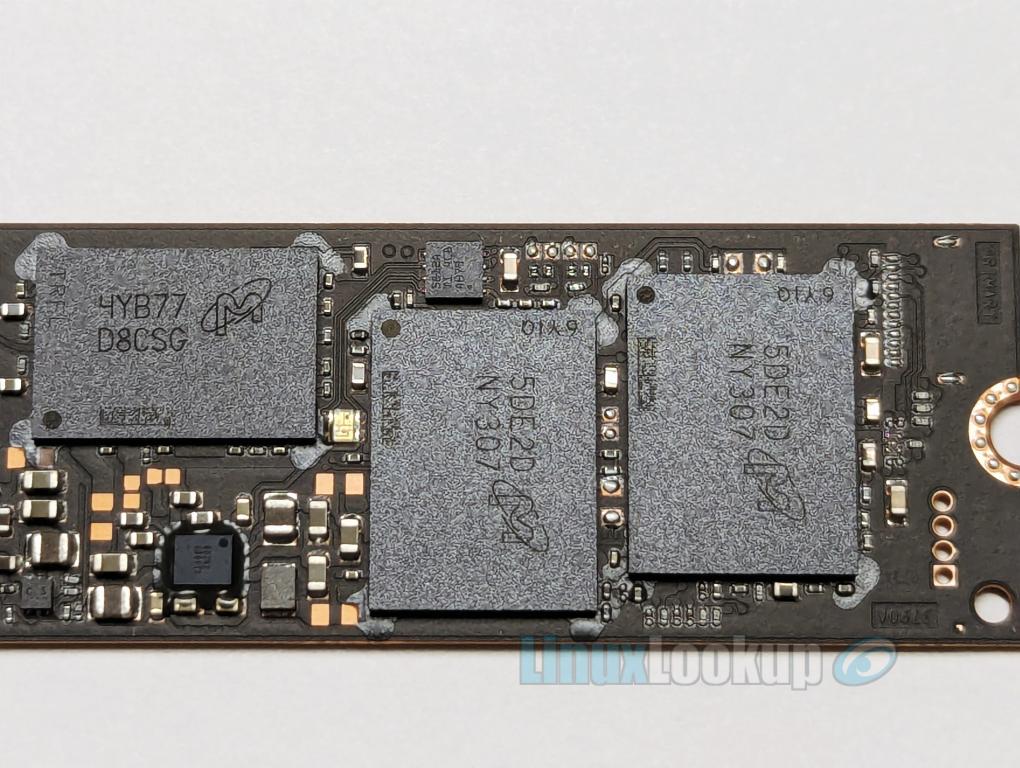 Here we can see the Silicon Motion SM2508 PCIe Gen5 x4 NVMe 2.0 SSD controller, Micron D8CSG (MT53E512M32D1ZW-046 AAT:B) LPDDR4 for caching (1GB per 1TB of NAND flash), and two Micron NY307 (MT29F8T08EQLEHL5-24QA:E) 276-layer G9 3D TLC NAND flash memory packs for storage.